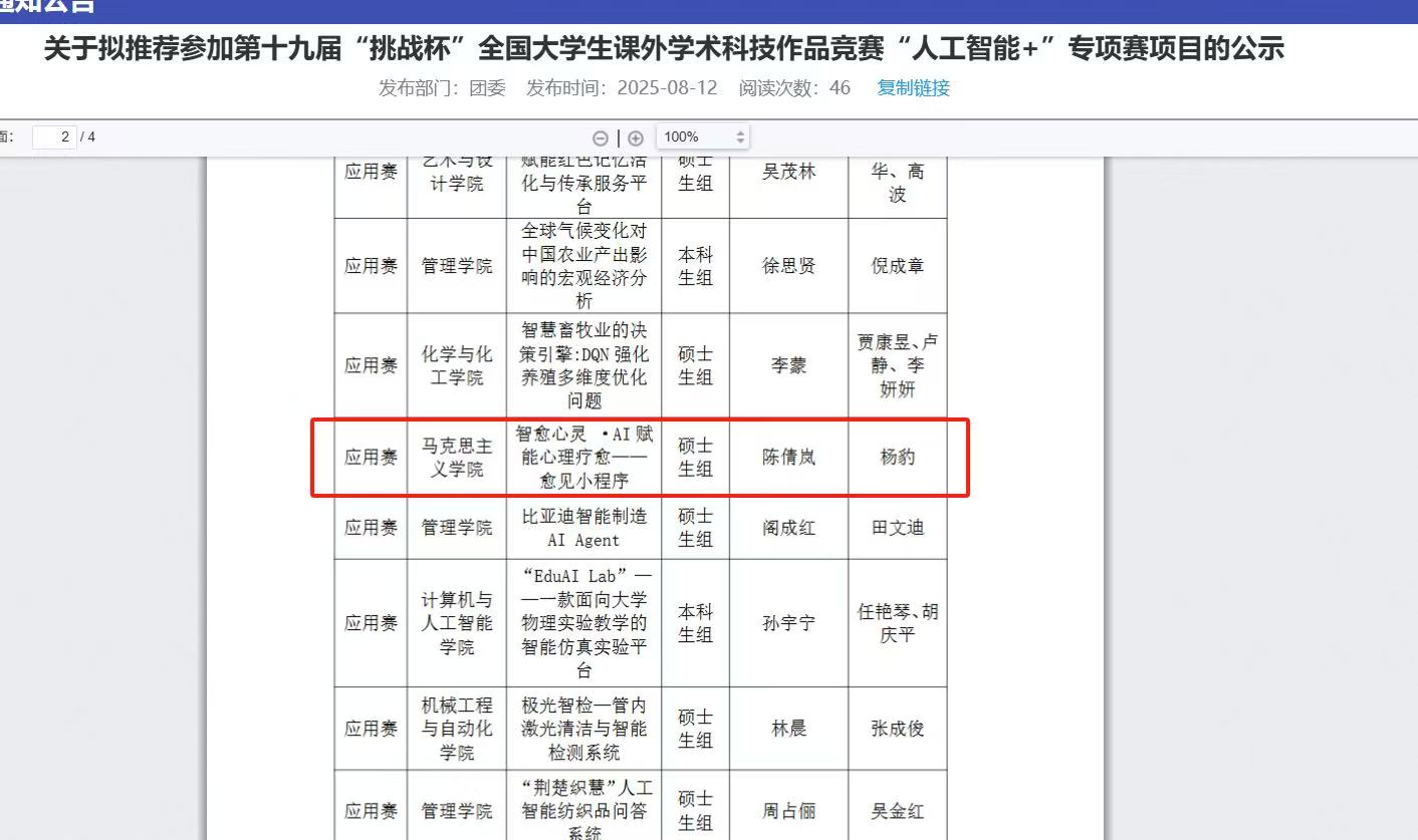 近日,从第十九届“挑战杯”全国大学生课外学术科技作品竞赛“人工智能+”专项赛道传来喜讯,禁漫天堂下载 陈倩岚同学的团队项目“智愈心灵。AI赋能心理疗愈—愈见小程序”在院赛中荣获一等奖,并成功通过校赛选拔,获得推优进入国赛资格。这一创新项目将人工智能技术与心理健康领域深度融合,展现了科技赋能社会福祉的无限可能。