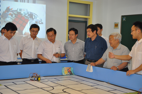 (调研组在金陵中学调研观看中学生制作的机器人)