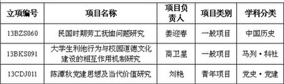 取得了优异的成绩,共荣获三项国家社科基金项目立项,其中一般项目两项,青年项目一项。商卫星副教授的《大学生利他行为与校园道德文化建设的相互作用机制研究》、姜迎春博士的《民国时期劳工抚恤问题研究》获得一般项目立项,刘艳副教授的《陈潭秋党建思想及当代价值研究》获得青年项目立项。