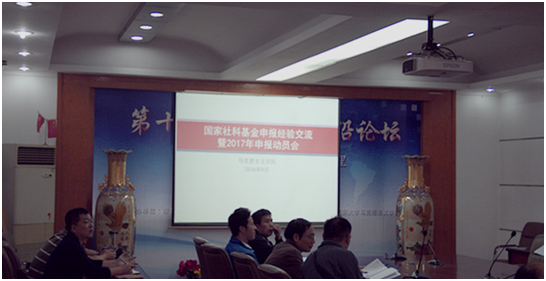 会议室举行了“国家社科基金申报经验交流暨2017年申报动员会”。本次会议由副院长孙文礼主持,朱丽霞院长及各学科带头人、科研学术骨干教师参加了此次会议。