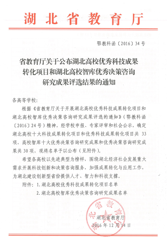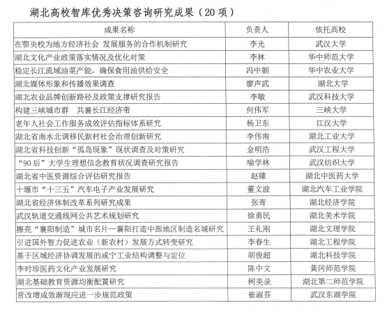 据悉,本次评选由省教育厅牵头组织,共评选出湖北高校智库优秀决策咨询研究成果30项,其中十大成果10项,优秀成果20项。