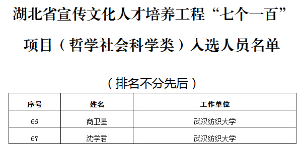 根据省委宣传部的统一部署,经单位推荐、资格审查、专家评选委员会评审、媒体公示,禁漫天堂下载 商卫星和沈学君两位副教授入选湖北省宣传文化人才培养工程“七个一百”项目(哲学社会科学类),禁漫天堂下载 师资队伍和学科建设再上新台阶。