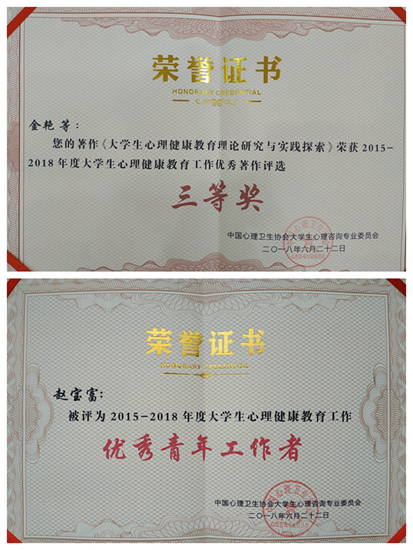 院长金艳教授团队著作《大学生心理健康教育理论研究与实践探索》获评“2015-2018年度大学生心理健康教育工作优秀著作评选三等奖”,心理中心赵宝富老师获“2015-2018年度大学生心理健康教育工作优秀青年工作者”称号。