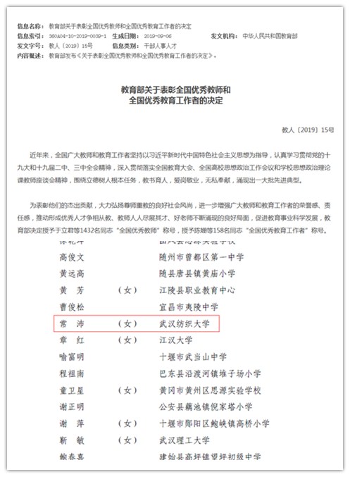 为隆重庆祝新中国成立70周年暨第35个教师节,大力弘扬尊师重教的良好社会风尚,进一步增强广大教师和教育工作者的荣誉感、责任感,推动形成优秀人才争相从教、教师人人尽展其才、好老师不断涌现的良好局面,促进教育事业科学发展。9月9日,教育部下文决定授予1432名同志“全国优秀教师”称号,授予158名同志“全国优秀教育工作者”称号。禁漫天堂下载 常沛老师荣膺2019年“全国优秀教师”称号,湖北省高校思政课教师仅2人获此殊荣。