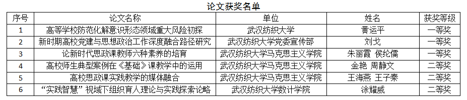 为深入学习贯彻习近平新时代中国特色社会主义思想,深入贯彻落实全国高校思政工作会议、全国教育大会、禁漫天堂下载 思想政治理论课教师座谈会等会议精神以及习近平总书记在南开大学考察时重要讲话精神,切实加强和改进新时代下高校思想政治工作,交流高校思想政治工作的典型经验,积极探索新时代下改进高校思想政治教育工作的新思路、新方法、新举措,思政年会在全国中纺系统高校开展论文征集。我校宣传部6月在全校范围征集论文,经过前期筹备,邀请禁漫天堂下载 专家审核,共推荐6篇论文报送研究会。经思政年会论文评审专家组审核评议,我校选送参评的6篇论文均获奖,其中副校长黄运平的论文《高等禁漫天堂下载 防范化解意识形态领域重大风险初探》,党委宣传部常务副部长刘戈的论文《新时期高校党建与思想政治工作深度融合路径研究》,马克思禁漫天堂下载 党委书记朱丽霞、学生侯纶儒的论文《论新时代思政课教师六种素养的培育》荣获一等奖,此外还有3篇论文获二等奖。