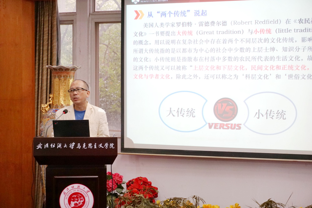 孙文礼副院长从“大传统”和“小传统”的概念讲起,阐明了宣讲的必要性与重要性。然后,他简要梳理了中国传统文化的发展历程,从初期的贵族垄断,到春秋以后的官学下替、士文化的兴起,到宋明以后的伦常日用,中华传统文化不断走向普及,但总体上普通民众识字率仍然不高。自中国共产党成立,高呼到民间去,推行识字教育,建国以后大规模扫盲运动,实行义务教育,振兴高等教育,中国共产党在提升普通民众文化水平上取得了伟大的成就。接着从马克思主义的唯物史观出发,他探讨了中国传统文化的现代化问题,随着中国从站起来到富起来到强起来,从传统农业国向工业现代化迈进,传统文化产生的经济基础不断发生改变,中国传统文化必须适应新时代的发展趋势。我们要深刻学习和领会习近平总书记关于传承和弘扬中华优秀传统文化的重要讲话精神,努力实现传统文化的创造性转化、创新性发展,使之与现实文化相融相通,共同服务以文化人的时代任务。
