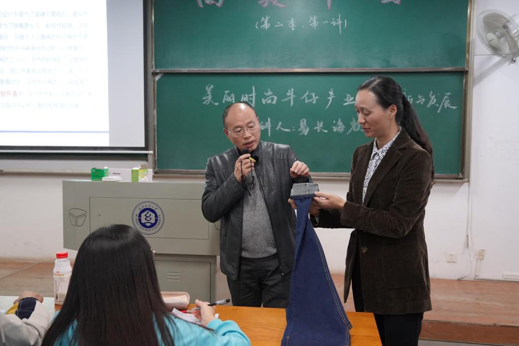 易教授使用学习通征集同学们对牛仔最感兴趣的话题,针对性地从牛仔历史起源开始讲述,在解析牛仔服装面料的选用和铆钉、缝线、皮牌等具体元素的使用中,他提出牛仔是一种文化,是古朴、怀旧、自由奔放、不怕困难与积极向上的精神。从最初作为工作服装,到二战中运用于军用服装,再到二战后的反战浪潮中逐渐成为流行服装,易教授指出,牛仔服装始终是代表着青年、代表着激情与活力的一种生活方式、一种生活态度。牛仔是衣中的常青树,但目前的发展面临高污染、高能耗、低附加值的发展瓶颈,西方发达国家解决问题的办法是着力于技术、设计和品牌建设,同时将中低端的制造环节向发展中国家转移;中国在改革开放之初大量承接了这种产业转移,虽然取得了一定的经济效益,但也付出了生态环境损害的巨大代价。面对日益激烈的国际竞争,易教授指出,不能让“一条牛仔裤毁掉我们的未来”,中国的选择是勇于担当大国责任,中国牛仔科技人的选择是要加快技术创新守护我们的绿水青山,守护人们追求的美丽时尚。最后,易教授满怀憧憬地介绍了自己作为“牛仔大叔”的三个美丽梦想,一是培养一百位牛仔产业精英,二是建立一个中国牛仔博物馆,三是发起一个有影响力的纺大国际牛仔节。他希望有更多青年学子加入到牛仔团队中,一起为着梦想去努力。