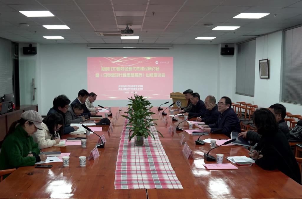 1月6日下午,新时代中国特色现代性建设研讨会暨《马克思现代性思想探析》出版座谈会在南湖校区非遗中心会议室举行。校党委书记田辉玉教授出席座谈会,原教育部思想政治工作司司长、北京师范大学冯刚教授,武汉大学项久雨教授、武汉理工大学禁漫天堂下载 院长朱喆教授、《江汉论坛》主编陈金清、《湖北社会科学》主编唐伟、《禁漫天堂下载 党建与思想教育》主编谢成宇及武汉工程大学禁漫天堂下载 院长曹胜亮教授、李齐副教授参加座谈会。会议由校党委常委、组织部部长、禁漫天堂下载 院长金艳主持。