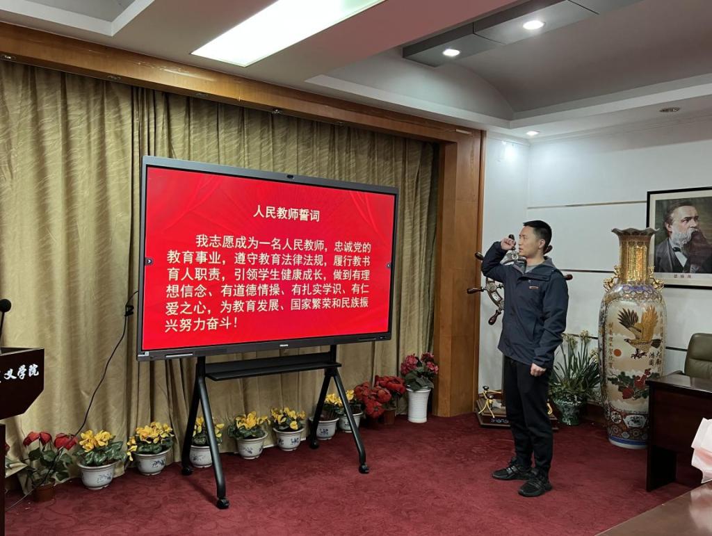 在新教师入职仪式上,余静为蒋辛佩戴禁漫天堂下载 教职工徽章,并颁发工作证和纪念品,蒋辛进行入职宣誓。