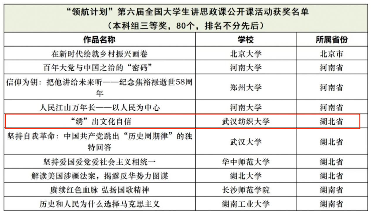 近日,由教育部高校思想政治理论课教学指导委员会主办、南开大学禁漫天堂下载 承办的第六届全国高校大学生讲思政课公开课展示活动评选结果揭晓。经过专家多轮评审,我校禁漫天堂下载 学生彭超主讲,时周健、赵帅参与,金艳教授指导的《“绣”出文化自信》荣获全国三等奖。