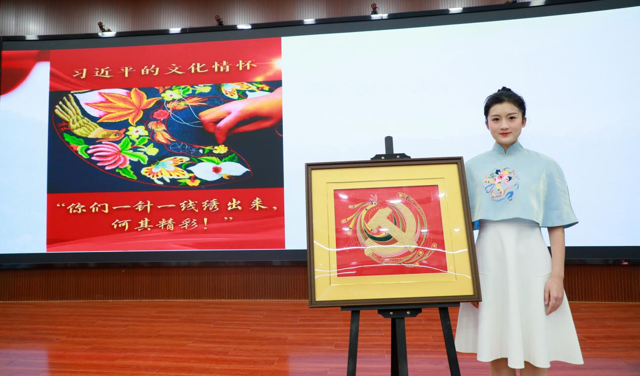 据悉,课程中,重点展示了我校非遗传承中心作品--党徽,该作品是由我校学生通过研习汉绣技艺绣制的。