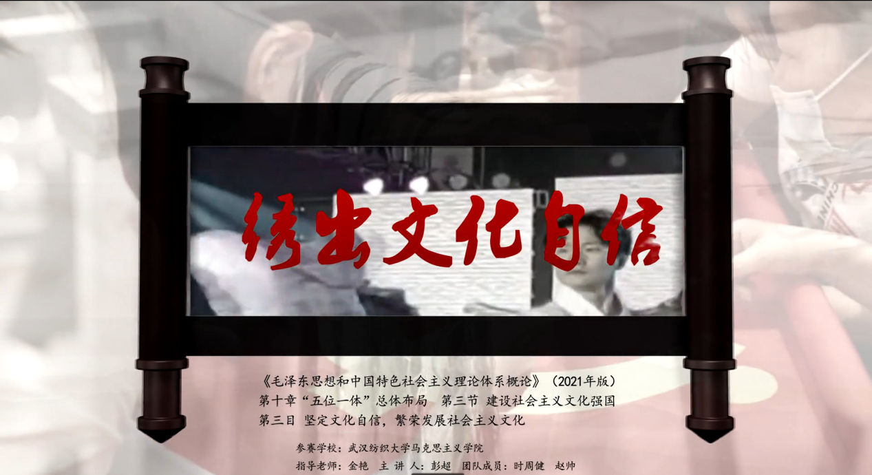 本次参赛作品在金艳教授的指导下紧紧围绕“青春献礼二十大·强国有我新征程”主题,精心凝练题目,制作教学文本、课件和视频,组织试教、讲评,打磨出的高质量思政课内容。课程以“绣”出文化自信为题,彰显纺大特色,青马担当。