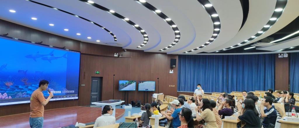 培训人员对老师们进行了设备的操作培训,着重介绍了如何操作设备以及如何将自己的教学内容与设备相匹配等技术层面的问题。在培训人员的辅助下,老师们纷纷上台,进行实际操作,探索如何使用VR技术创设教育情境。