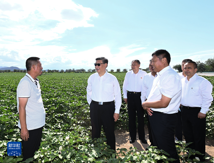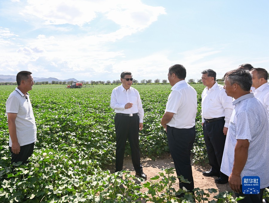 7月12日至15日,中共中央总书记、国家主席、中央军委主席习近平在新疆考察。这是13日下午,习近平在新疆生产建设兵团八师一四三团农一连棉花种植基地考察。新华社记者 申宏 摄
