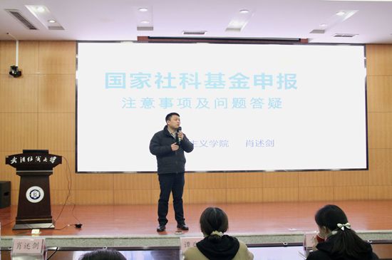肖述剑从国家社科基金申报基本情况简介、申报流程与评审标准、申报细节与注意事项、心得体会与个人建议四个方面进行了细致的讲解,着重强调要注意课题申报方向和选题规划,提出要追踪学术热点、形成系统思维和注重学习积累。