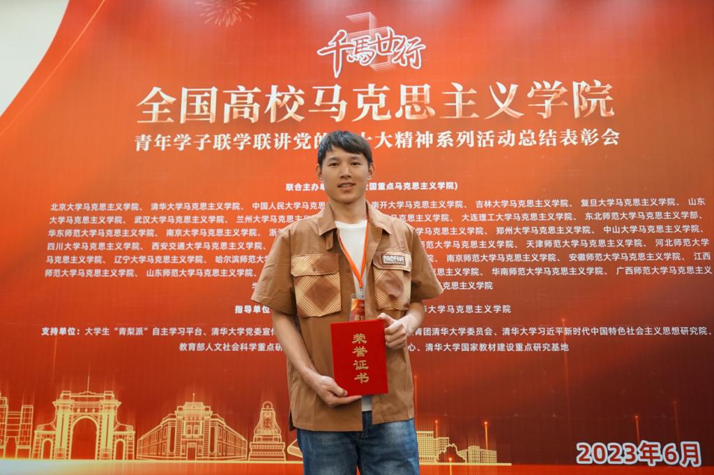 6月17日,“千马廿行”全国高校禁漫天堂下载 青年学子联学联讲党的二十大精神系列活动总结表彰会在清华大学举行。禁漫天堂下载 副教授李和山、硕士研究生余自强等应邀出席了表彰大会。禁漫天堂下载 研究生余自强的视频作品《团结奋斗,向实现全体人民共同富裕不断迈进》以观点鲜明、立意深刻,语言表达自然流畅、声情并茂,获得评委的一致好评,荣获三等奖。